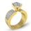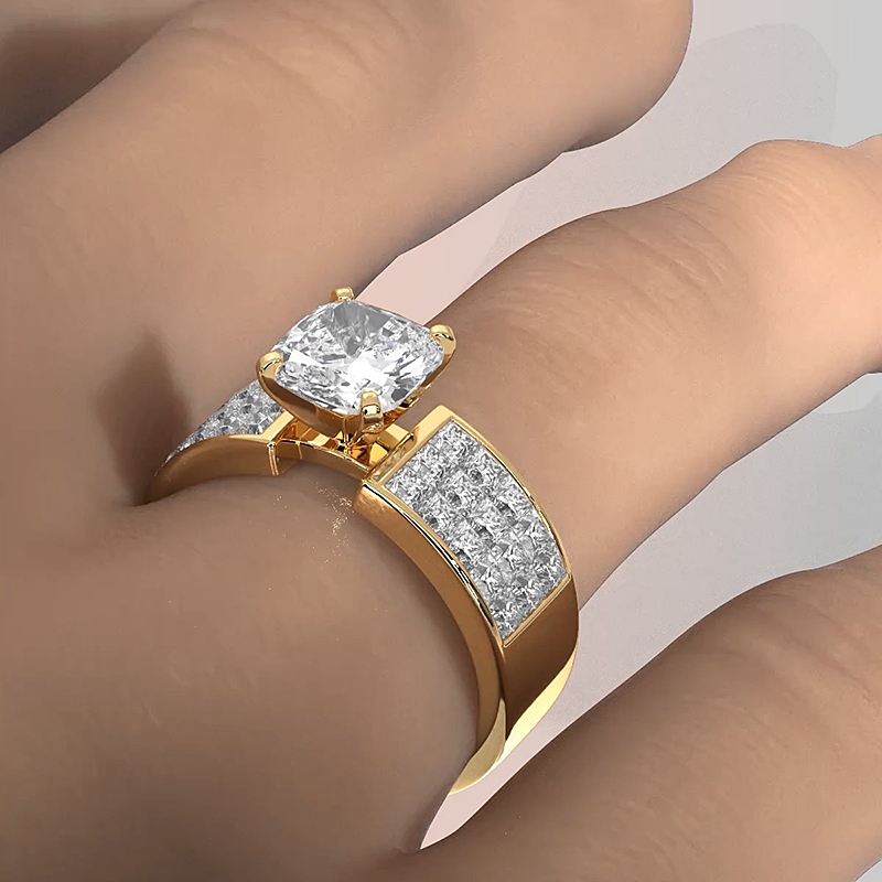 Classic Side Stone 4 Prong style Engagement Ring, center is Cushion shape Diamond Report by GIA, E Color & VVS1 clarity, Made in 18k Yellow Gold (1.79 ct. tw.)