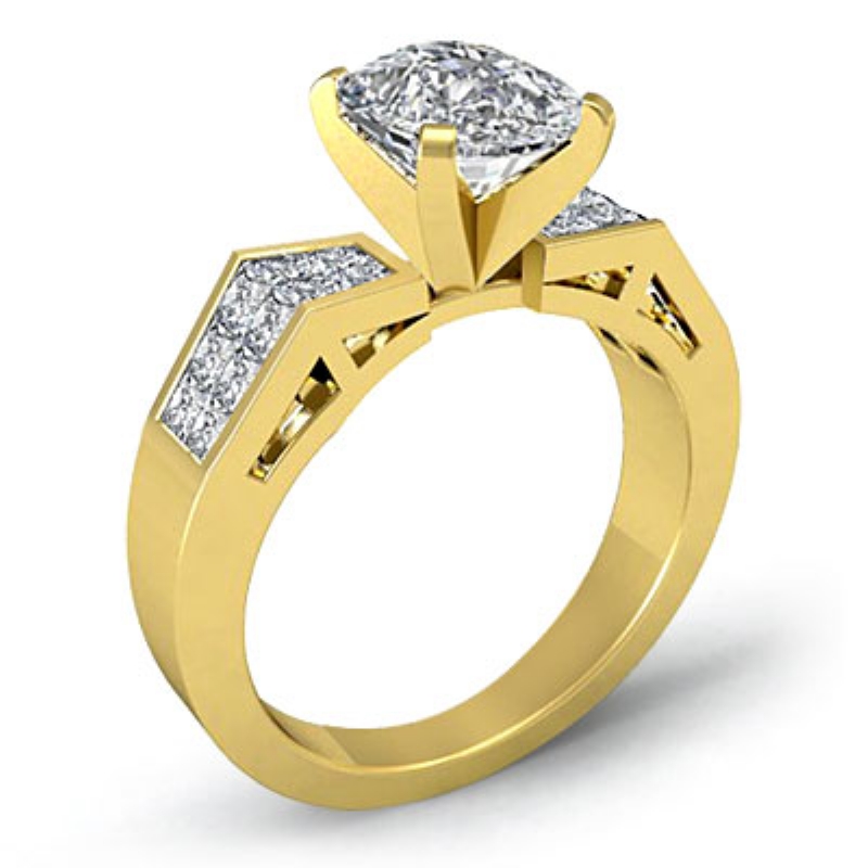 Invisible Classic Side Stone style Engagement Ring, center is Cushion shape Diamond Report by GIA, H Color & SI1 clarity, Made in 18k Yellow Gold (1.2 ct. tw.)