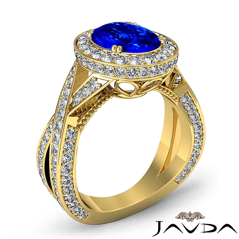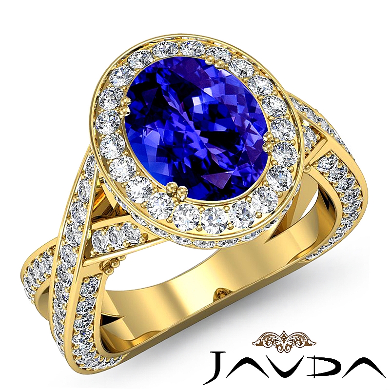 Halo Pave Set Cross Shank style Engagement Ring, center is Oval shape D Block Tanzanite Report by , Color & clarity, Made in 14k Yellow Gold (2.5 ct. tw.)