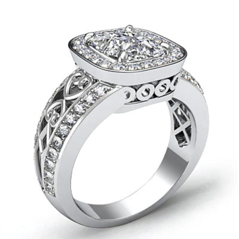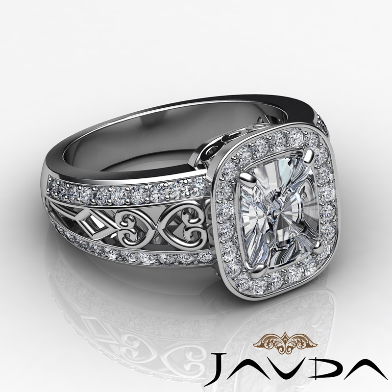 Halo Pave Set Filigree style Engagement Ring, center is Cushion shape Diamond Report by GIA, E Color & VVS2 clarity, Made in 18k White Gold (1.75 ct. tw.)