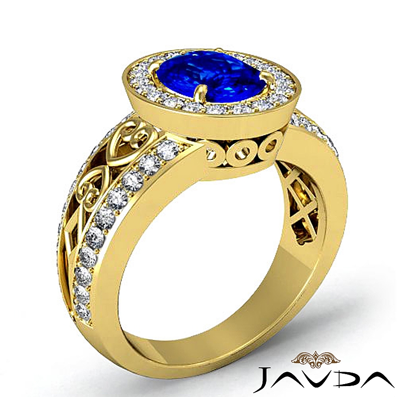 Halo Pave Filigree Shank style Engagement Ring, center is Oval shape D Block Tanzanite Report by , Color & clarity, Made in 14k Yellow Gold (1.75 ct. tw.)
