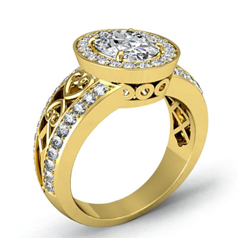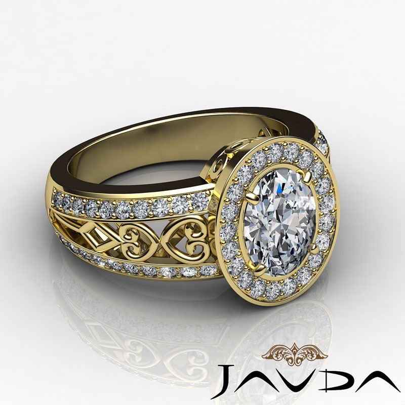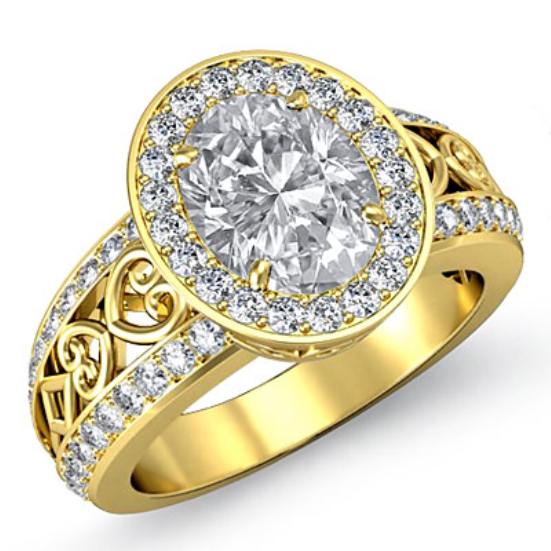 Halo Pave Filigree Shank style Engagement Ring, center is Oval shape Diamond Report by GIA, F Color & SI2 clarity, Made in 18k Yellow Gold (1.65 ct. tw.)