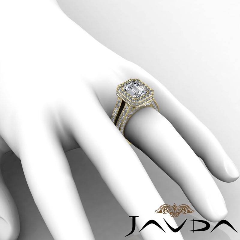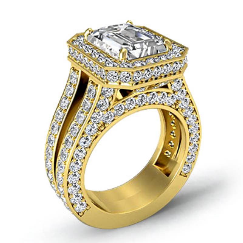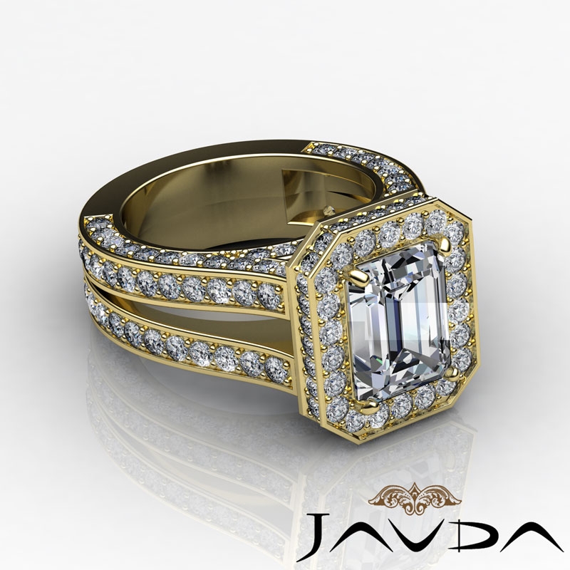 Split Shank Circa Halo Pave style Engagement Ring, center is Emerald shape Diamond Report by GIA, H Color & VVS1 clarity, Made in 14k Yellow Gold (3.02 ct. tw.)