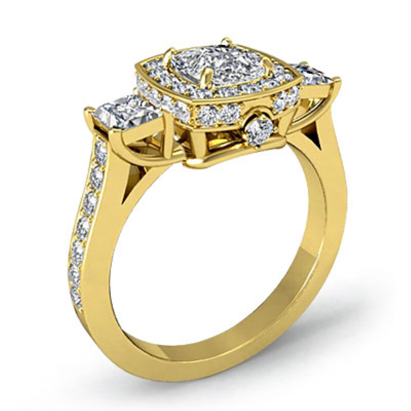 Diamond 3 Stone Engagement Princess Cushion Ring 14k Yellow Gold Halo Setting 1.1Ct.