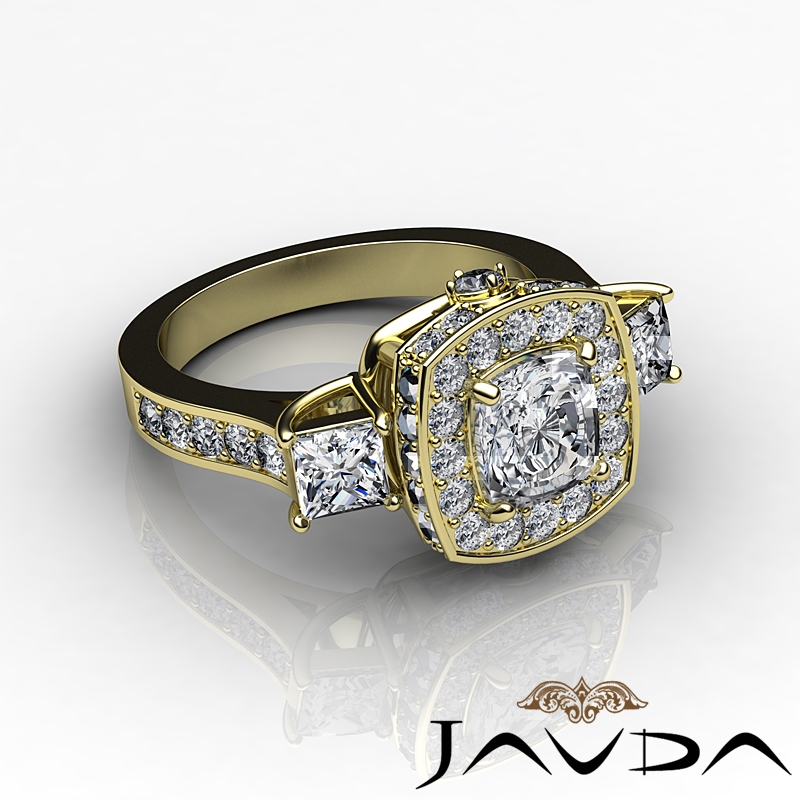 3 Stone Circa Halo Pave style Engagement Ring, center is Cushion shape Diamond Report by GIA, E Color & VVS2 clarity, Made in 14k Yellow Gold (2.1 ct. tw.)