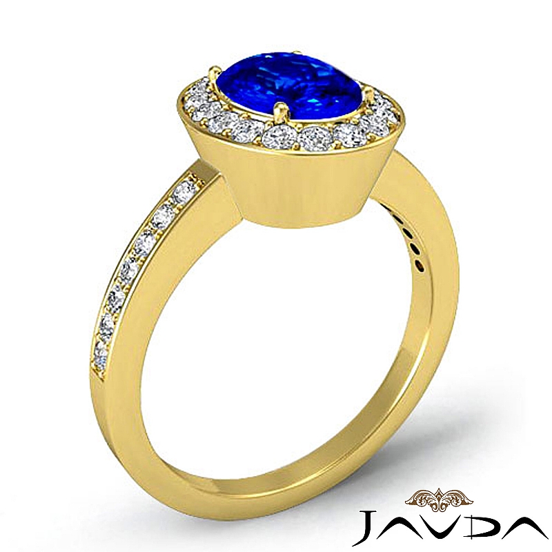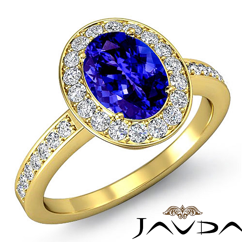 Halo Sidestone Pave Set style Engagement Ring, center is Oval shape D Block Tanzanite Report by , Color & clarity, Made in 14k Yellow Gold (2 ct. tw.)