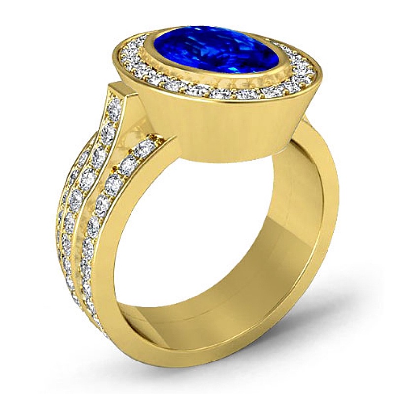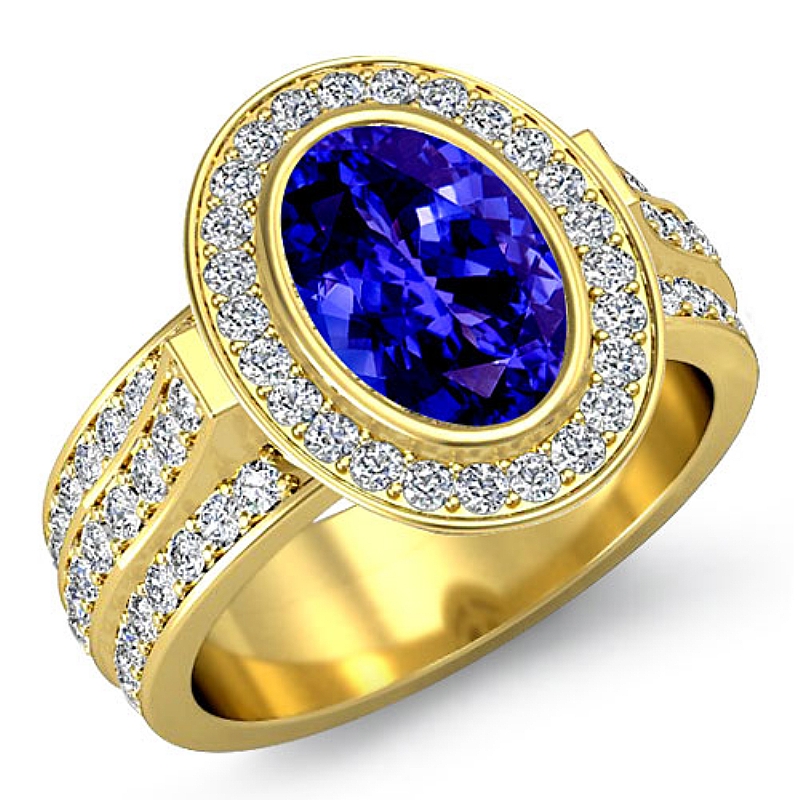 Halo Bezel Pave Set Shank style Engagement Ring, center is Oval shape D Block Tanzanite Report by , Color & clarity, Made in 14k Yellow Gold (2.65 ct. tw.)