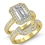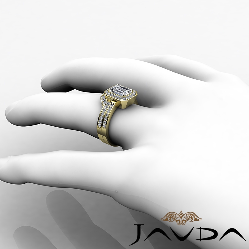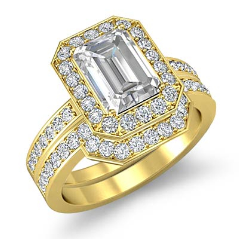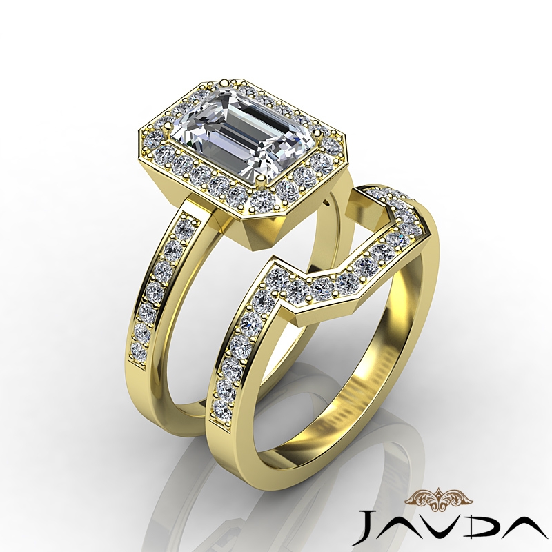 Halo Bridal Set Side-Stone style Engagement Ring, center is Emerald shape Diamond Report by GIA, J Color & VVS1 clarity, Made in 18k Yellow Gold (1.92 ct. tw.)