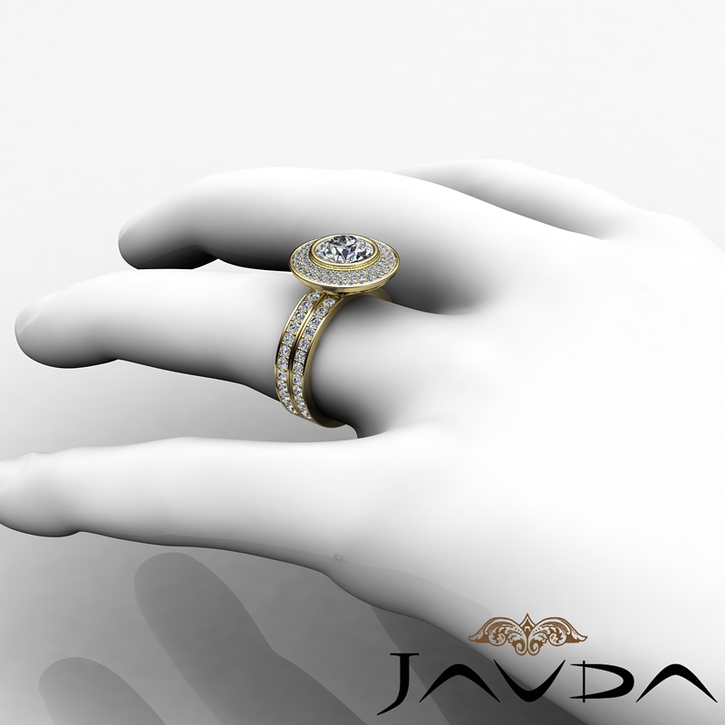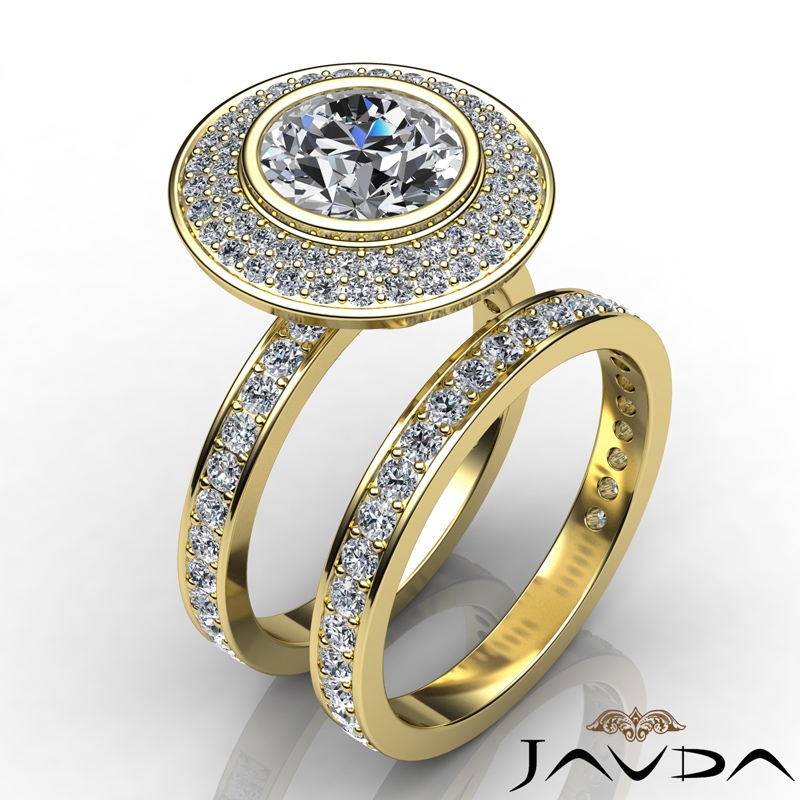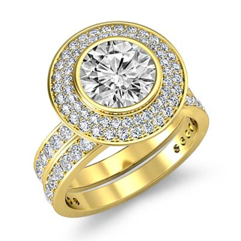 Bezel Gala Halo Bridal Set style Engagement Ring, center is Round shape Diamond Report by GIA, E Color & SI1 clarity, Made in 18k Yellow Gold (1.78 ct. tw.)