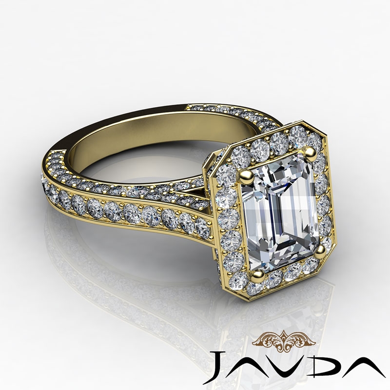 Cathedral Style Halo Pave Set style Engagement Ring, center is Emerald shape Diamond Report by GIA, F Color & VS2 clarity, Made in 18k Yellow Gold (3.17 ct. tw.)