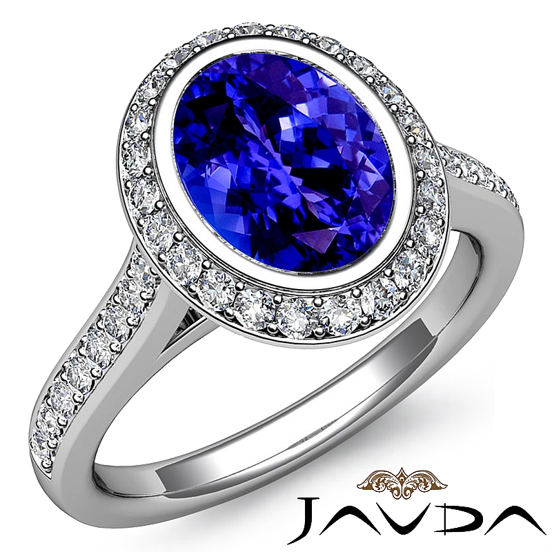 Halo Bezel Pave Setting style Engagement Ring, center is Oval shape D Block Tanzanite Report by , Color & clarity, Made in 18k White Gold (1.8 ct. tw.)