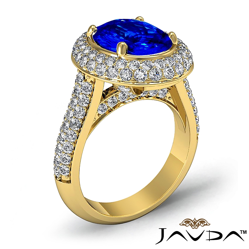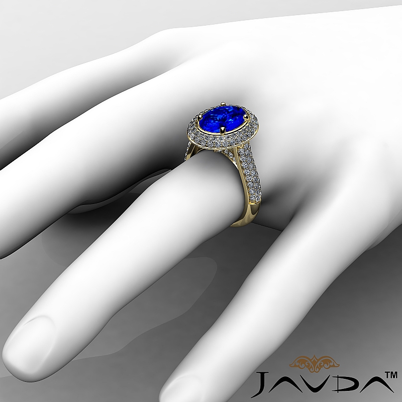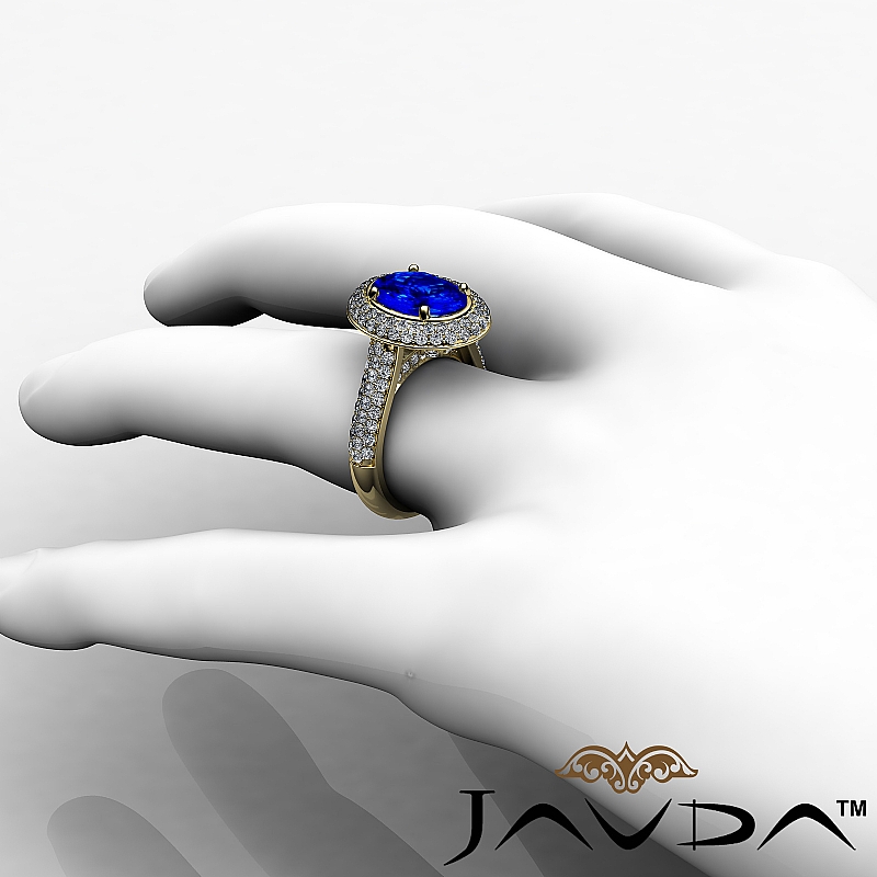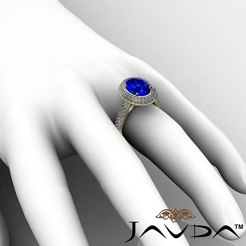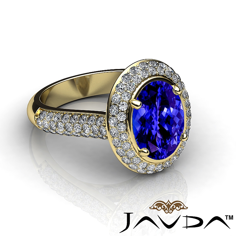Gleaming Double Halo Pave style Engagement Ring, center is Oval shape D Block Tanzanite Report by , Color & clarity, Made in 18k Yellow Gold (2.5 ct. tw.)