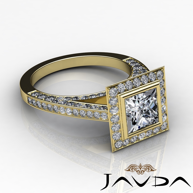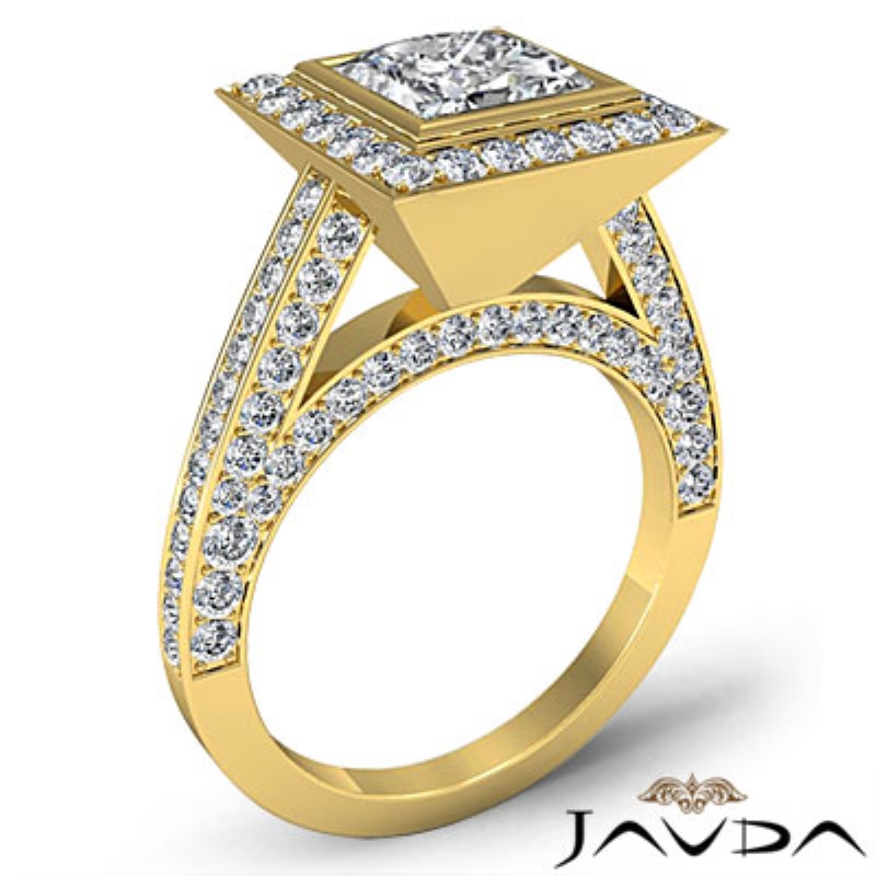 Bezel Halo Bridge Accent style Engagement Ring, center is Princess shape Diamond Report by GIA, J Color & VS1 clarity, Made in 18k Yellow Gold (2.61 ct. tw.)