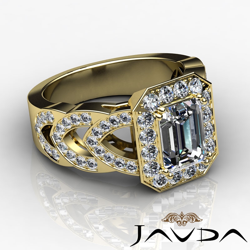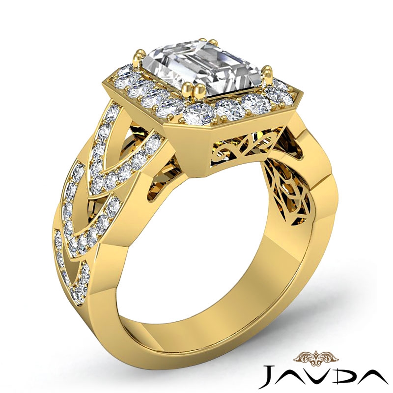 Designer Shank Halo Pave style Engagement Ring, center is Emerald shape Diamond Report by GIA, J Color & VS1 clarity, Made in 14k Yellow Gold (2.25 ct. tw.)