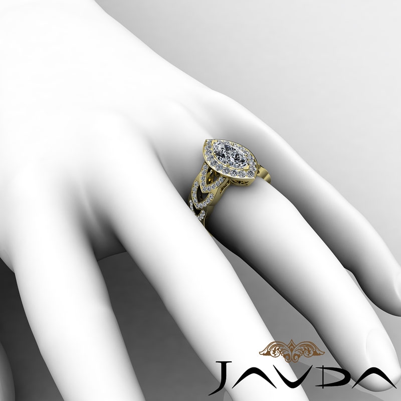 Designer Shank Halo Pave style Engagement Ring, center is Marquise shape Diamond Report by GIA, F Color & VVS2 clarity, Made in 18k Yellow Gold (2.25 ct. tw.)