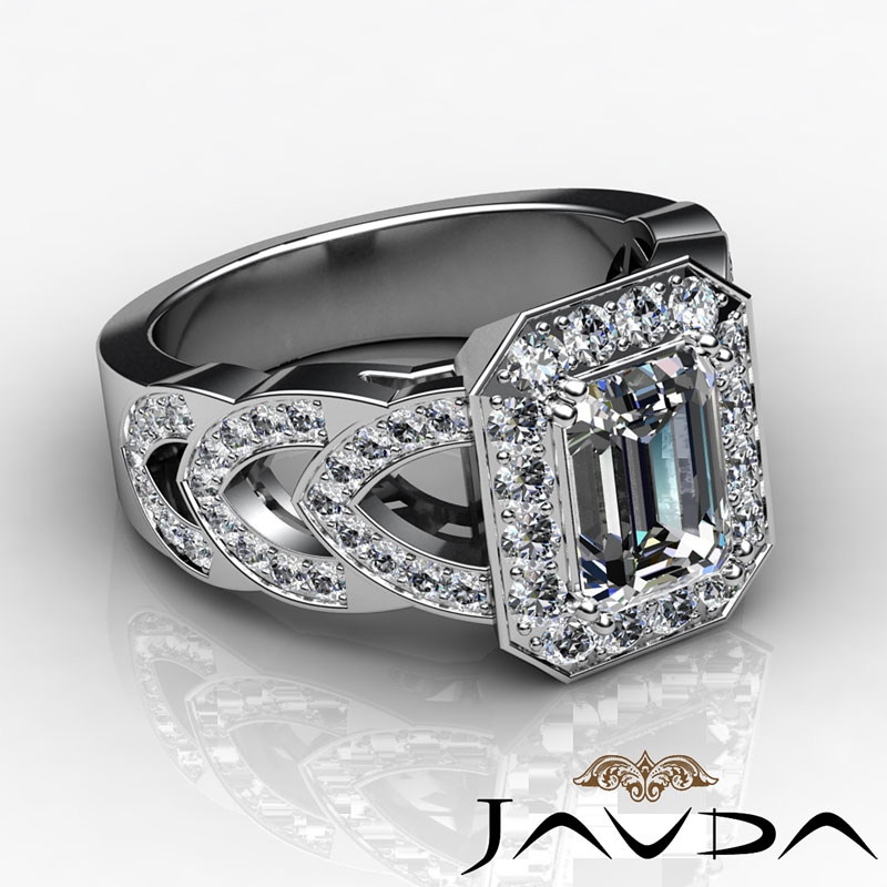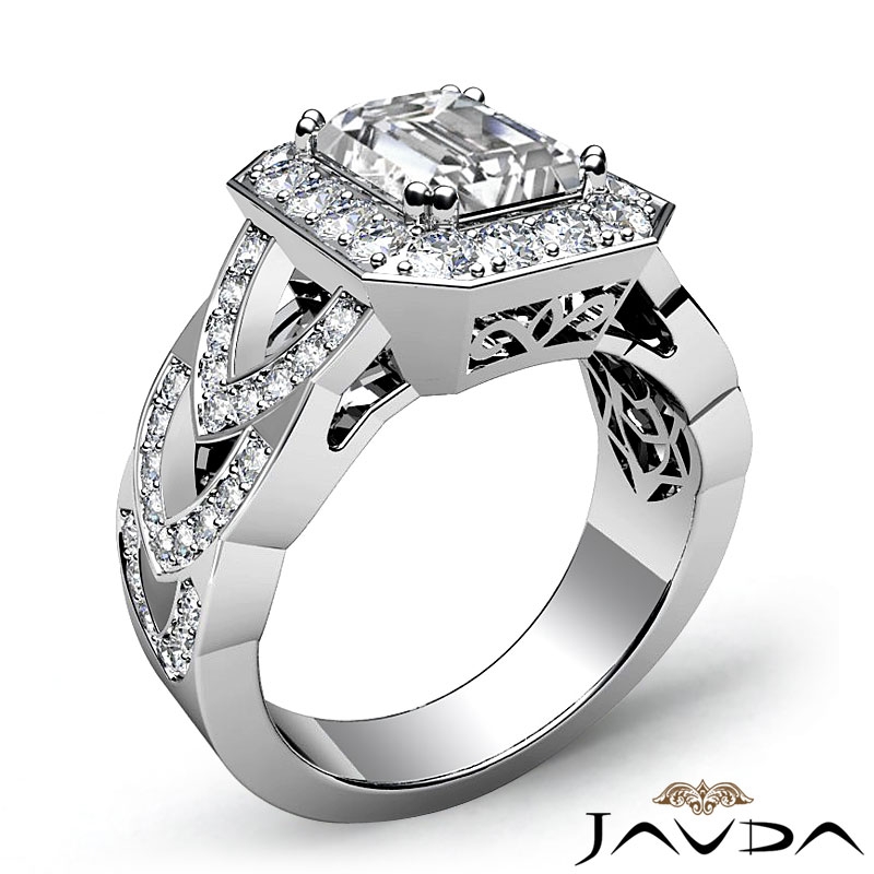 Designer Shank Halo Pave style Engagement Ring, center is Emerald shape Diamond Report by GIA, J Color & VS1 clarity, Made in Platinum 950 (2.25 ct. tw.)