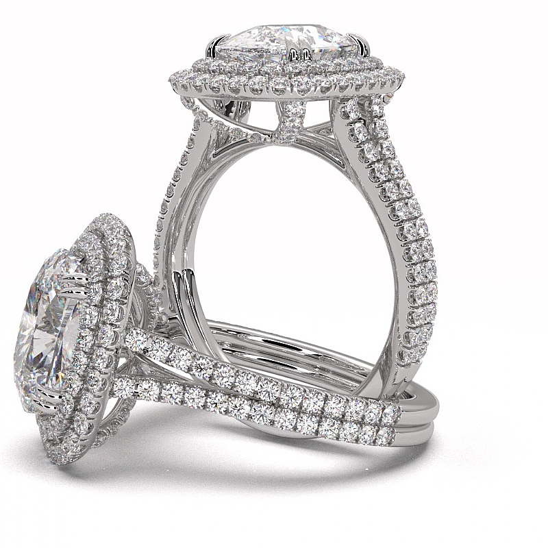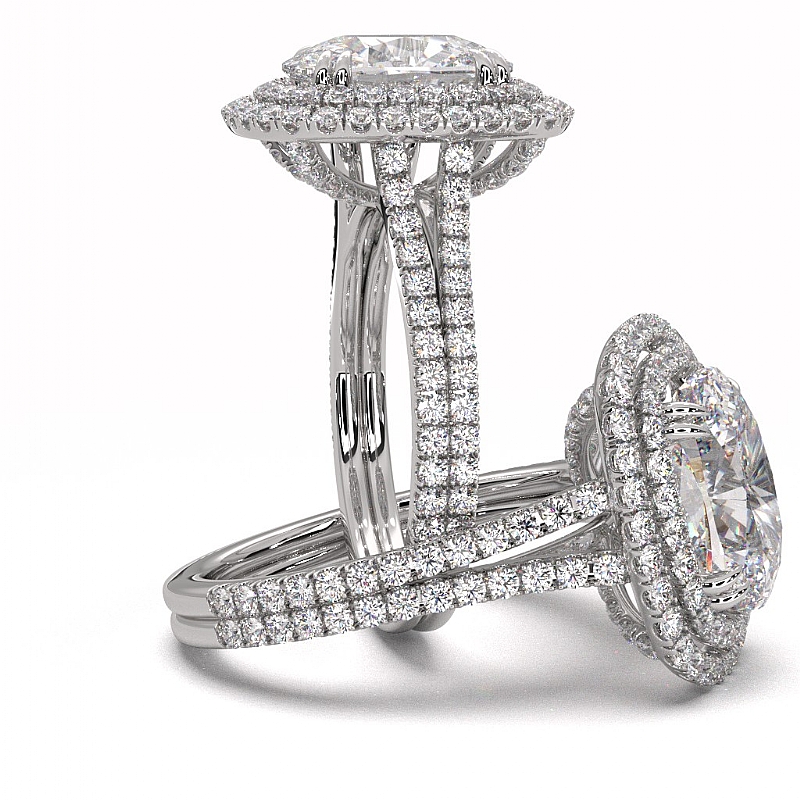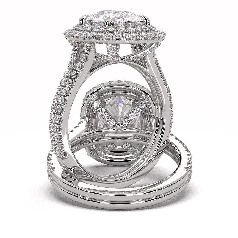 Gala Halo Pave Split Shank style Engagement Ring, center is Cushion shape Diamond Report by GIA, E Color & VVS2 clarity, Made in 18k White Gold (2.55 ct. tw.)