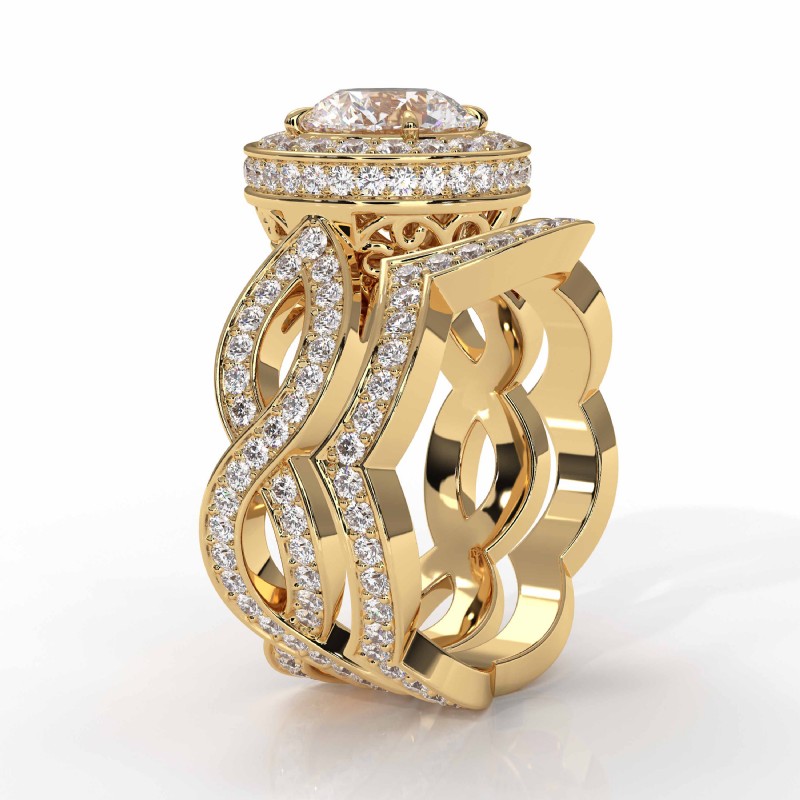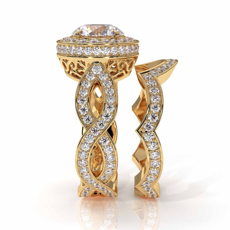 Infinity Shank Halo Bridal Set style Engagement Ring, center is Round shape Diamond Report by IGI, D Color & VS1 clarity, Made in 18k Yellow Gold (2.84 ct. tw.)