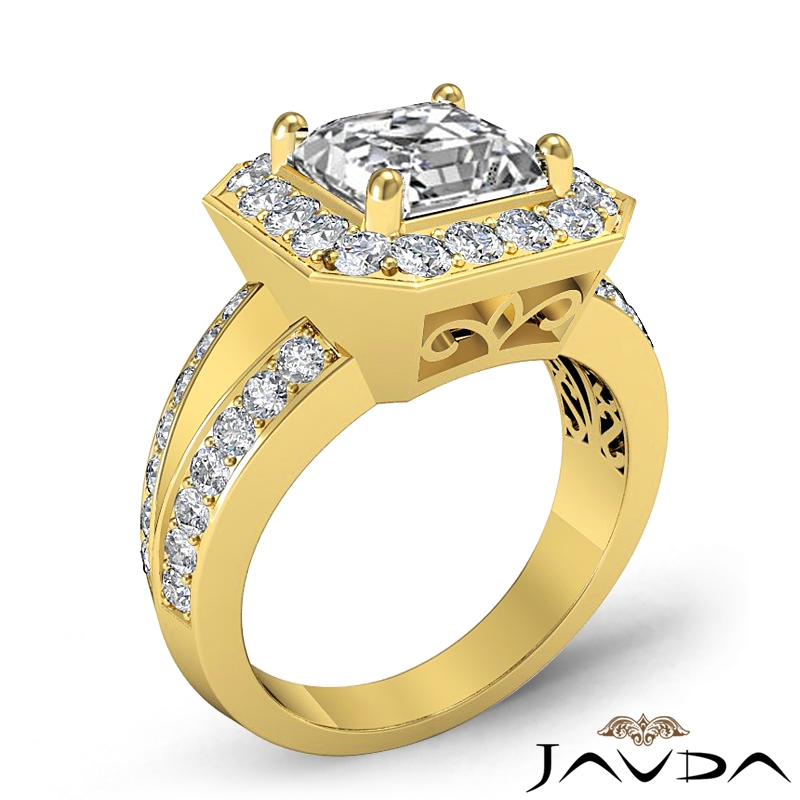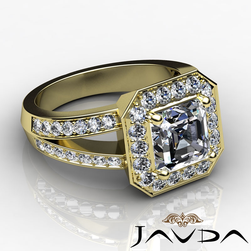 Split Shank Halo Sidestone style Engagement Ring, center is Asscher shape Diamond Report by IGI, D Color & VS1 clarity, Made in 18k Yellow Gold (3.13 ct. tw.)
