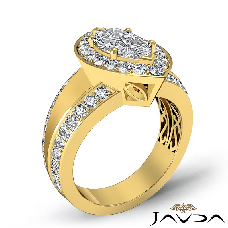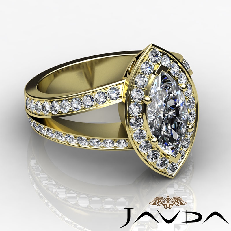 Split Shank Halo Side Stone style Engagement Ring, center is Marquise shape Diamond Report by GIA, J Color & VS2 clarity, Made in 18k Yellow Gold (1.24 ct. tw.)