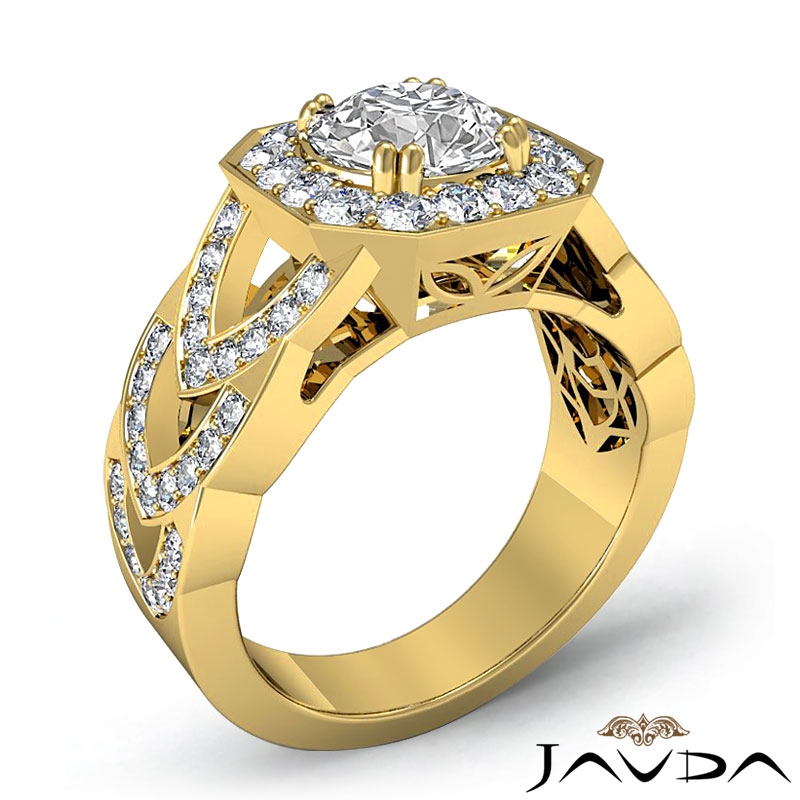 Halo Pave Set Filigree Shank style Engagement Ring, center is Round shape Diamond Report by IGI, F Color & VS2 clarity, Made in 18k Yellow Gold (3.02 ct. tw.)