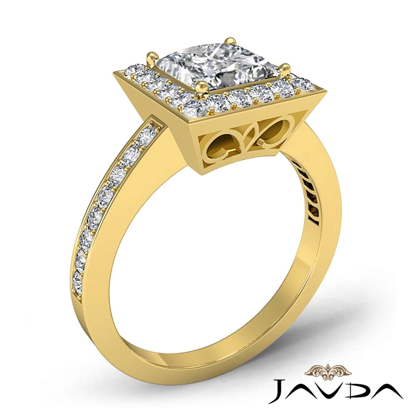 Halo Basket Micro Pave Set style Engagement Ring, center is Princess shape Diamond Report by GIA, J Color & VS1 clarity, Made in 18k Yellow Gold (1.29 ct. tw.)