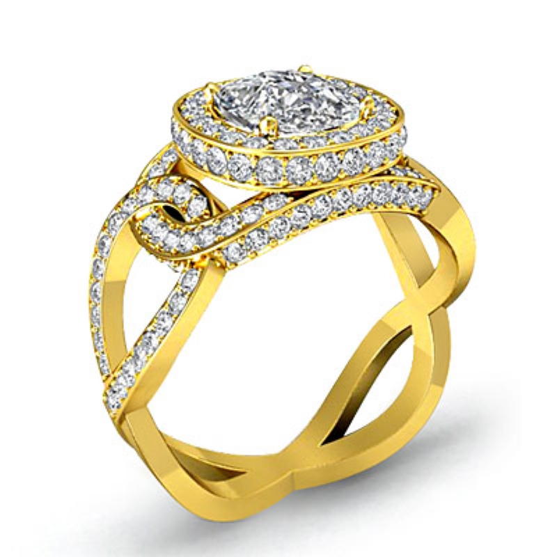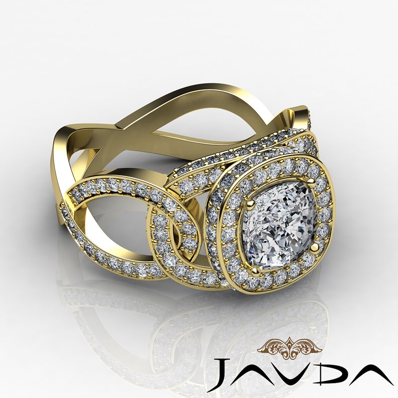 Twisted Shank Halo Pave style Engagement Ring, center is Cushion shape Diamond Report by GIA, H Color & SI1 clarity, Made in 14k Yellow Gold (2.6 ct. tw.)