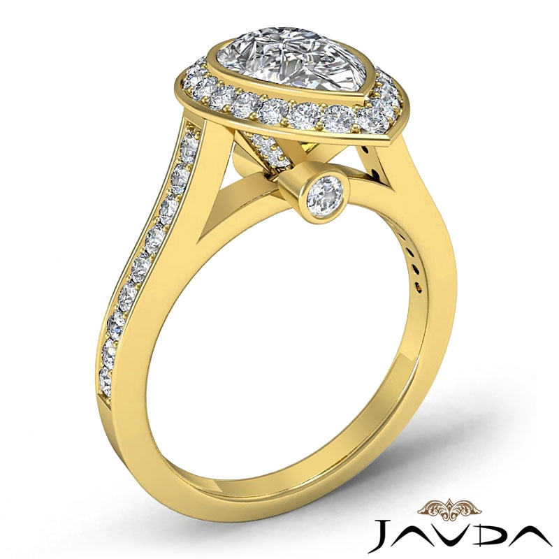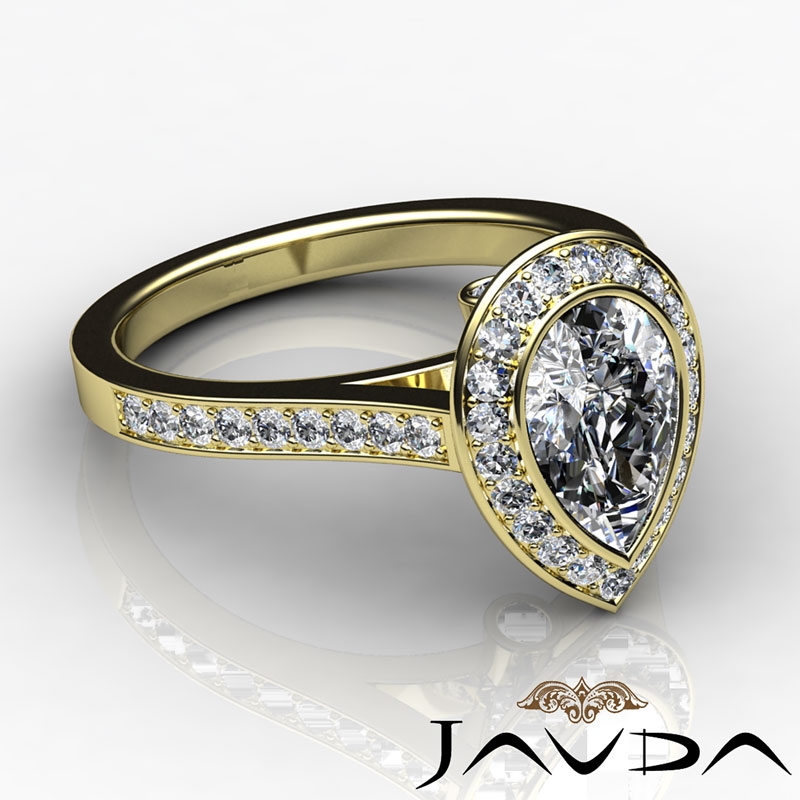 Halo Pave Bezel Set Cathedral style Engagement Ring, center is Pear shape Diamond Report by IGI, E Color & VS2 clarity, Made in 18k Yellow Gold (2.1 ct. tw.)