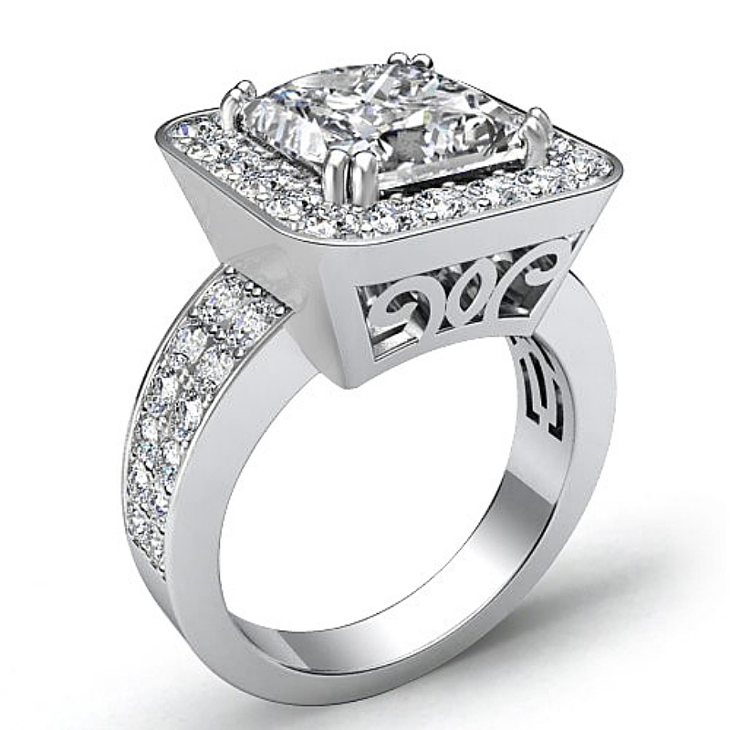 2 Row Shank Halo Pave Filigree style Engagement Ring, center is Princess shape Diamond Report by GIA, G Color & IF clarity, Made in 14k White Gold (1.52 ct. tw.)