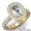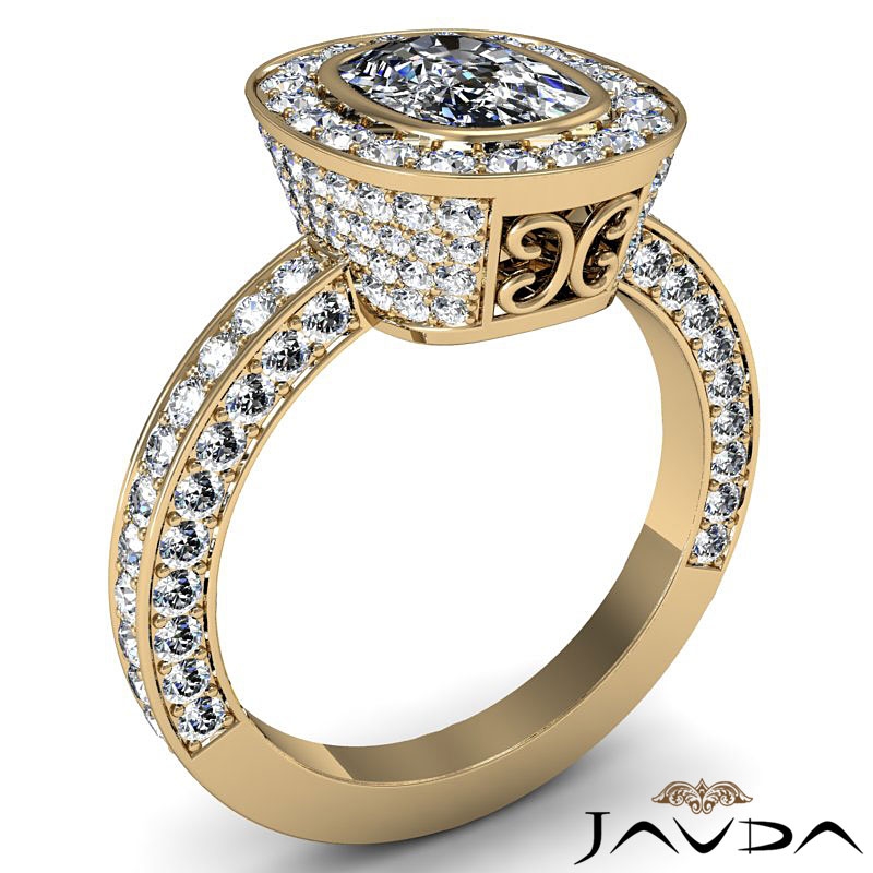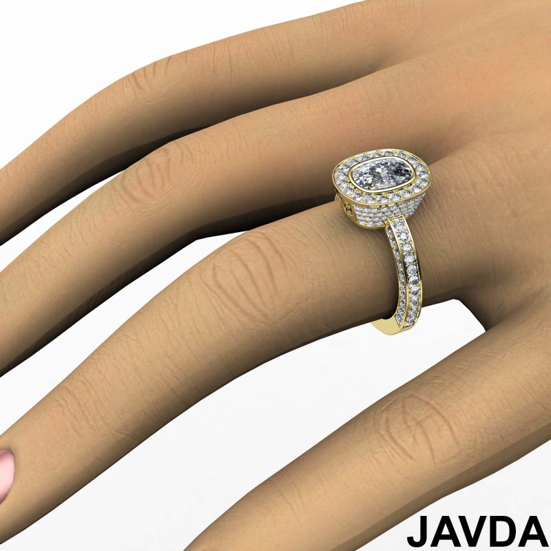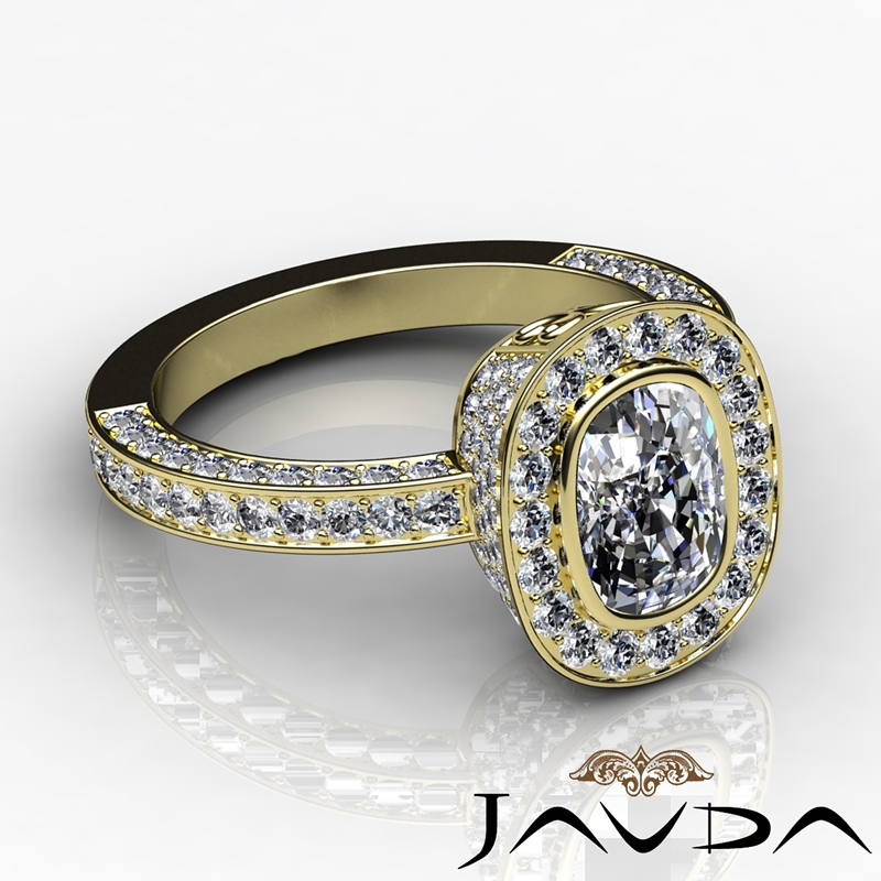 Bezel Halo Fine Pave Set style Engagement Ring, center is Cushion shape Diamond Report by GIA, J Color & VS1 clarity, Made in 14k Yellow Gold (2.61 ct. tw.)