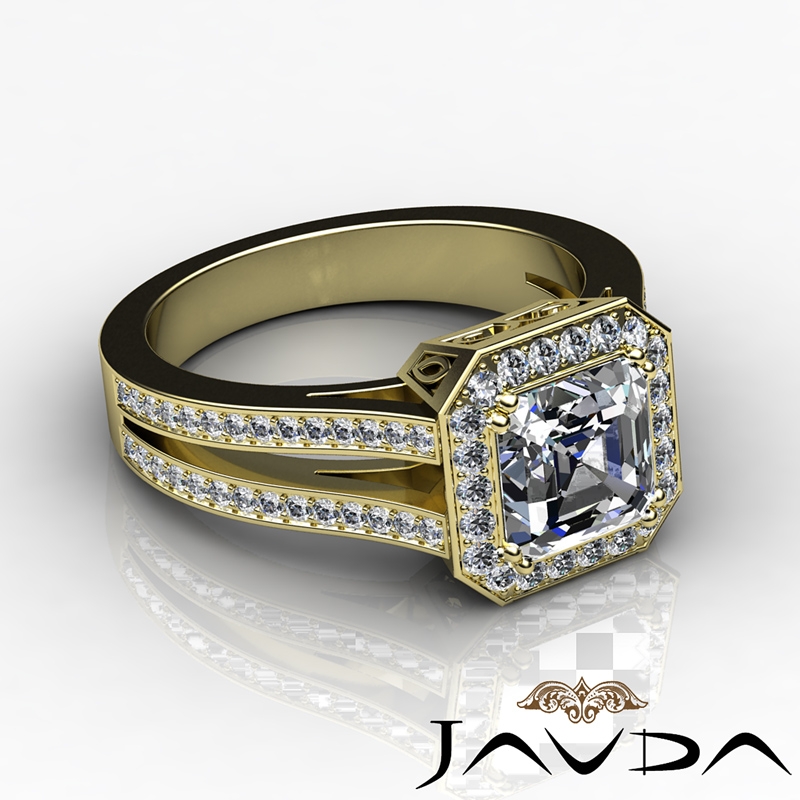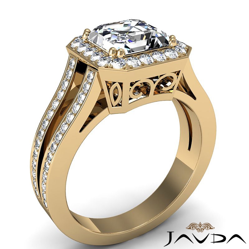 Split Shank Halo Pave Filigree style Engagement Ring, center is Asscher shape Diamond Report by IGI, D Color & VS1 clarity, Made in 14k Yellow Gold (3.38 ct. tw.)
