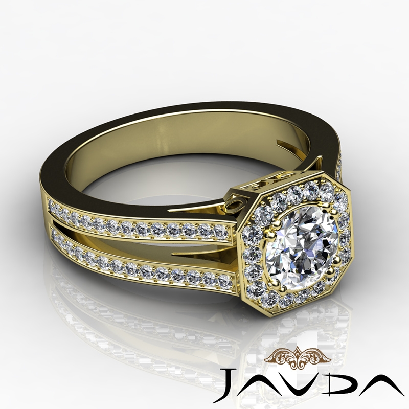 Hexagon Halo Pave Split Shank style Engagement Ring, center is Round shape Diamond Report by IGI, F Color & VS1 clarity, Made in 14k Yellow Gold (2.34 ct. tw.)
