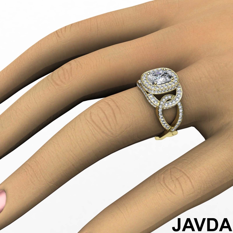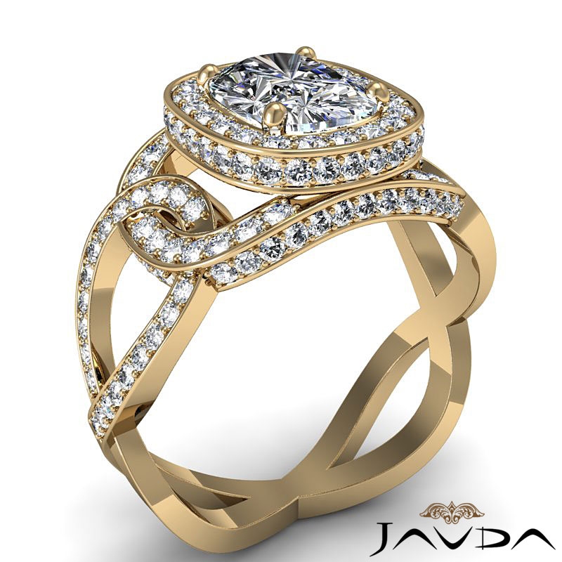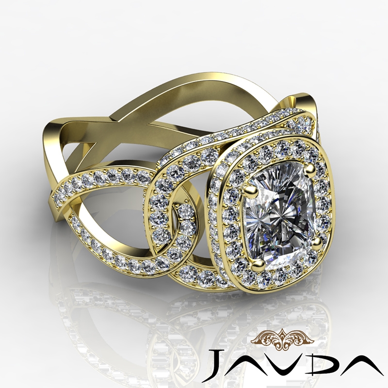 Halo Pave Interlocking Shank style Engagement Ring, center is Cushion shape Diamond Report by GIA, E Color & VVS2 clarity, Made in 18k Yellow Gold (2.28 ct. tw.)