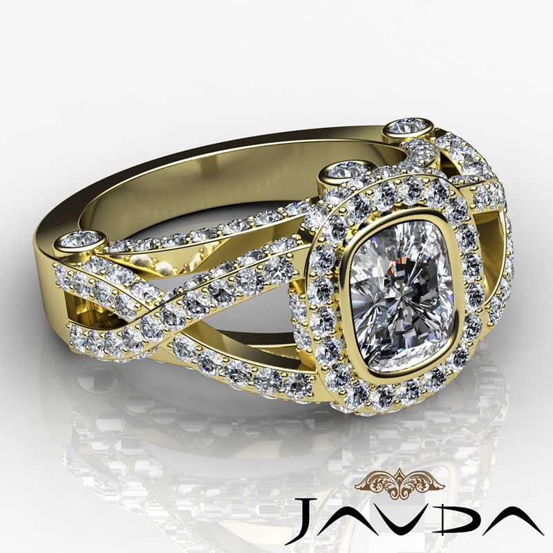 Cross Shank Bezel Halo style Engagement Ring, center is Cushion shape Diamond Report by GIA, E Color & VVS2 clarity, Made in 18k Yellow Gold (2.45 ct. tw.)