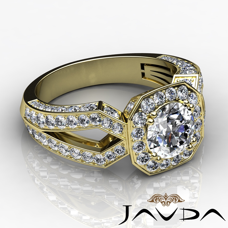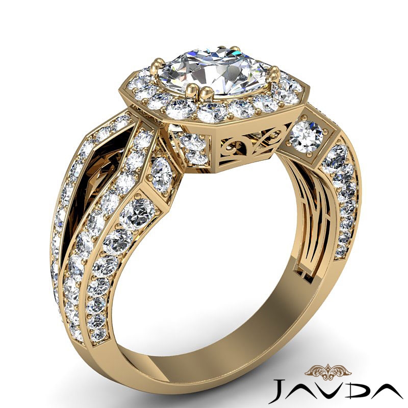 Hexagon Halo Split Shank style Engagement Ring, center is Round shape Diamond Report by GIA, I Color & SI1 clarity, Made in 18k Yellow Gold (2.45 ct. tw.)
