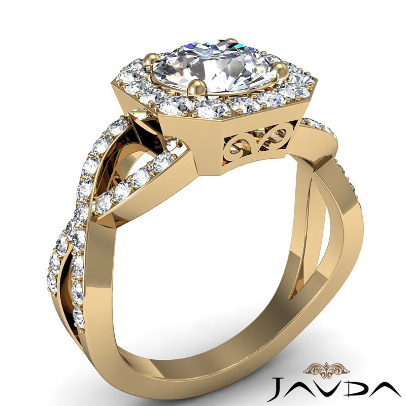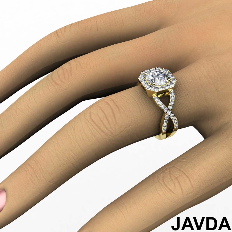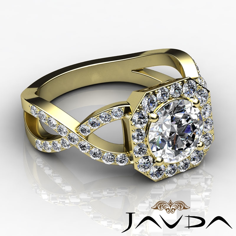 Hexagon Halo Pave Cross Shank style Engagement Ring, center is Round shape Diamond Report by GIA, I Color & SI1 clarity, Made in 14k Yellow Gold (1.63 ct. tw.)
