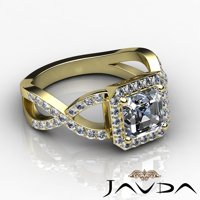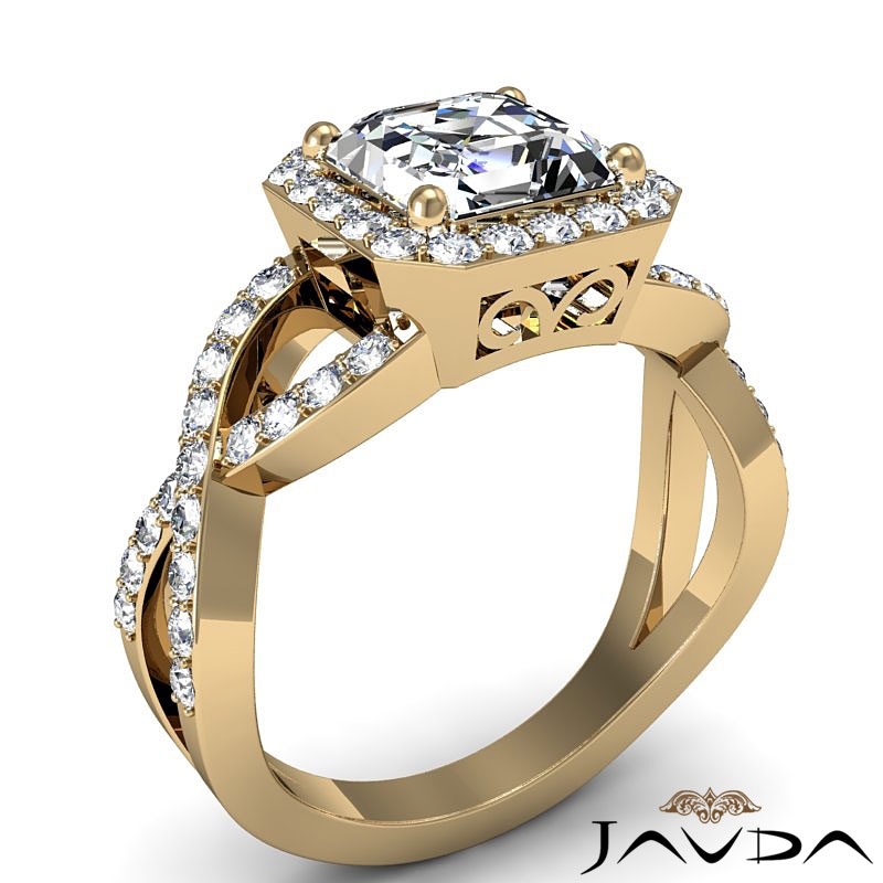 Cross Shank Halo Pave Filigree style Engagement Ring, center is Asscher shape Diamond Report by IGI, D Color & VS1 clarity, Made in 18k Yellow Gold (3.15 ct. tw.)