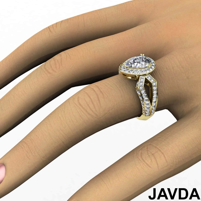 Halo Micro Pave Split Shank style Engagement Ring, center is Pear shape Diamond Report by GIA, I Color & SI2 clarity, Made in 18k Yellow Gold (2.26 ct. tw.)