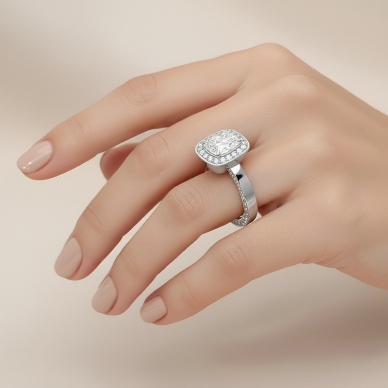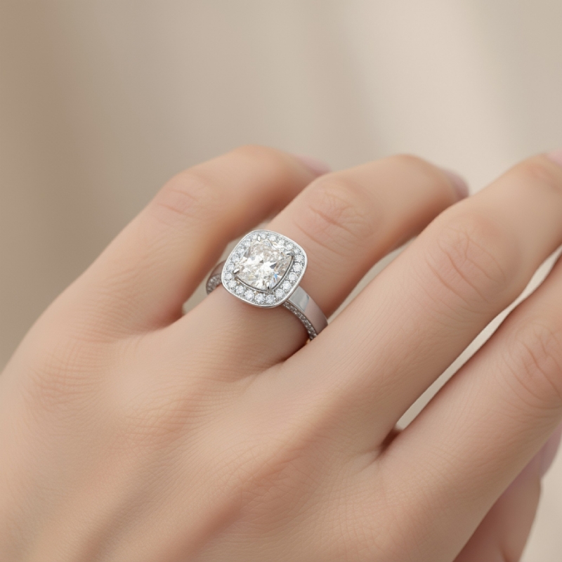 Cushion shape is diamond certified by GIA, 100% natural E color & VVS1 clarity {0.50 ctw.}.