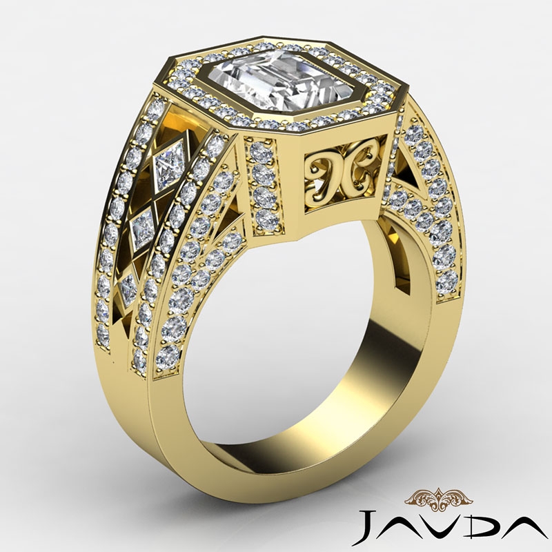 Vintage Style Bezel Halo Pave style Engagement Ring, center is Emerald shape Diamond Report by IGI, D Color & VS1 clarity, Made in 18k Yellow Gold (3.7 ct. tw.)