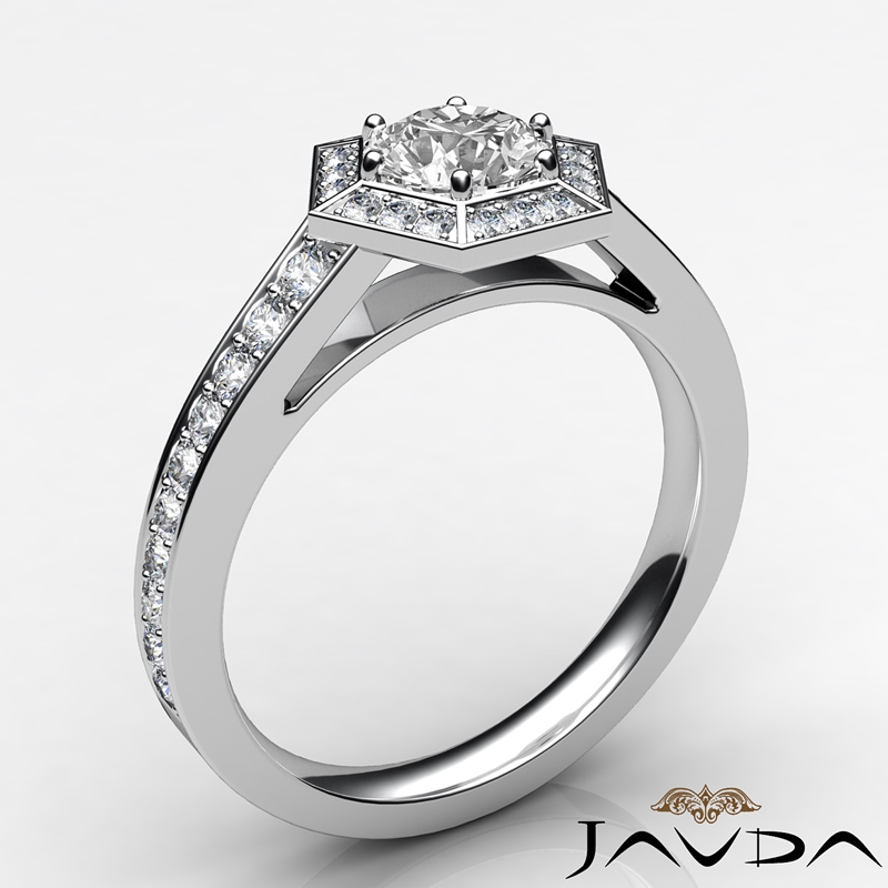 Hexagon Halo Micro Pave Set style Engagement Ring, center is Round shape Diamond Report by GIA, F Color & VS2 clarity, Made in 18k White Gold (1 ct. tw.)