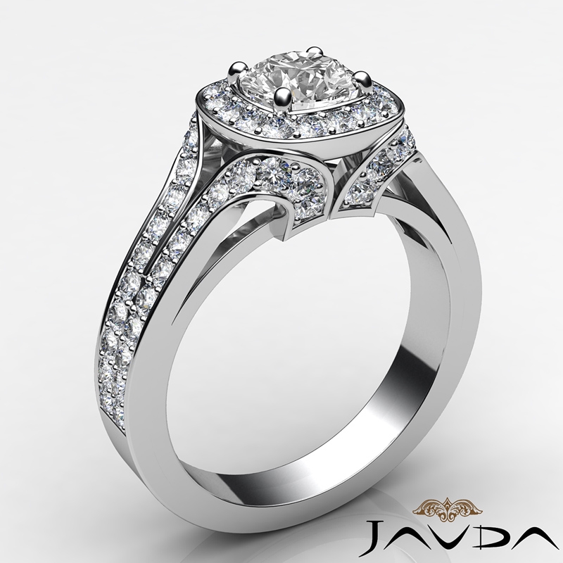 V-Shaped Split Shank Halo style Engagement Ring, center is Round shape Diamond Report by GIA, F Color & VS1 clarity, Made in 18k White Gold (1.9 ct. tw.)