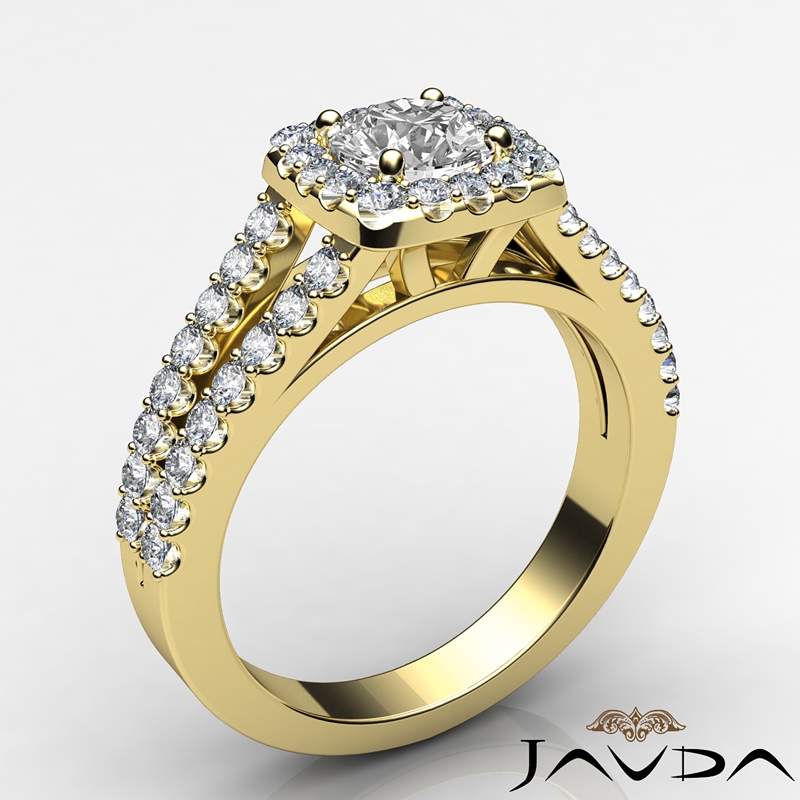 French U Pave Halo Split Shank style Engagement Ring, center is Round shape Diamond Report by GIA, F Color & VS1 clarity, Made in 14k Yellow Gold (1.25 ct. tw.)