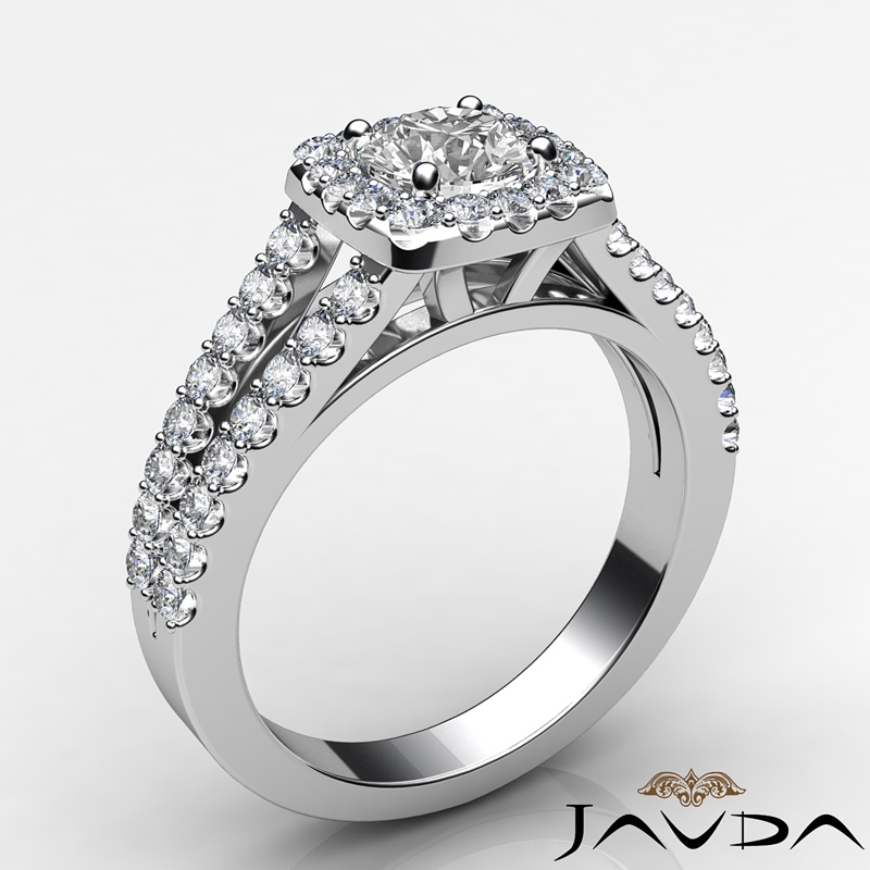 French U Pave Halo Split Shank style Engagement Ring, center is Round shape Diamond Report by GIA, F Color & VS1 clarity, Made in Platinum 950 (1.25 ct. tw.)