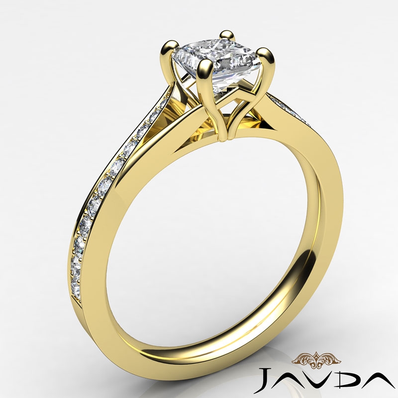 4 Prong Classic Side Stone style Engagement Ring, center is Princess shape Diamond Report by GIA, F Color & VVS2 clarity, Made in 18k Yellow Gold (0.86 ct. tw.)