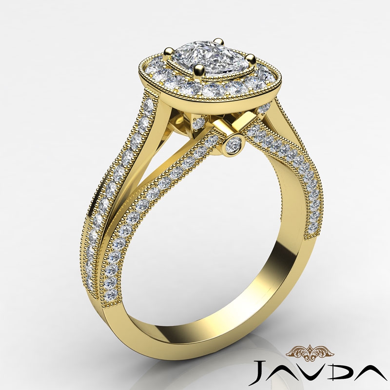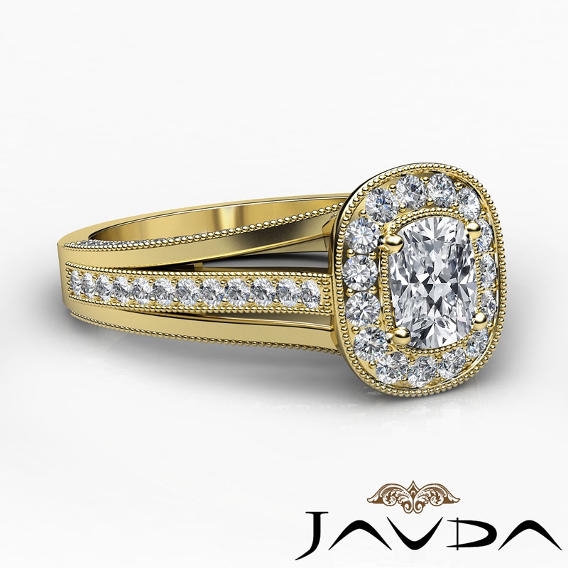 Halo Pave Diamond Engagement Cushion Semi Mount Millgrain Ring 14k Yellow Gold 0.9Ct.
