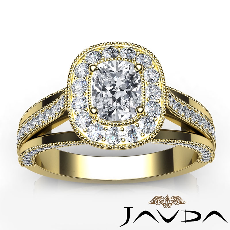 Split Shank Halo Milgrain Edge style Engagement Ring, center is Cushion shape Diamond Report by GIA, H Color & SI1 clarity, Made in 14k Yellow Gold (1.42 ct. tw.)