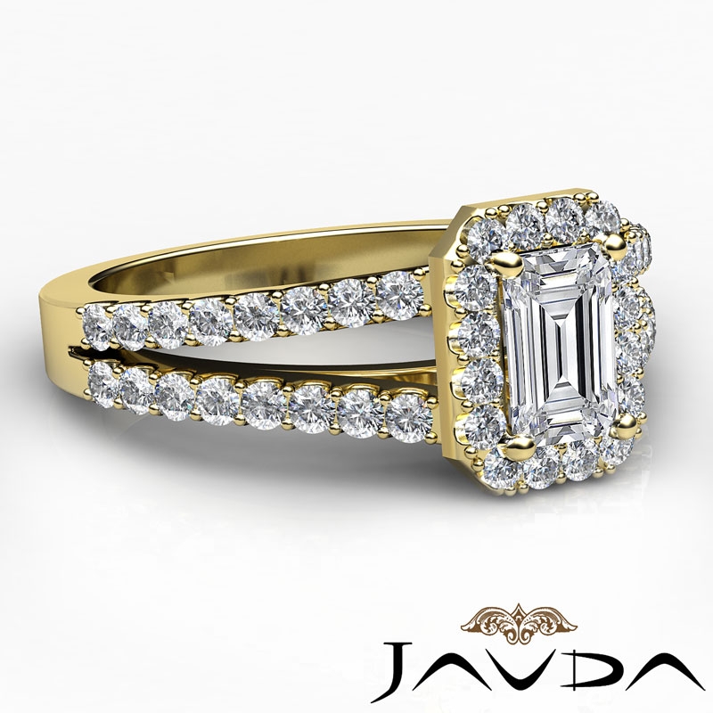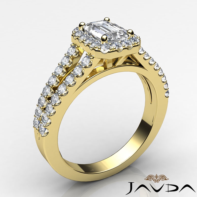 Split Shank Halo French Pave style Engagement Ring, center is Emerald shape Diamond Report by GIA, H Color & VVS1 clarity, Made in 18k Yellow Gold (1.25 ct. tw.)