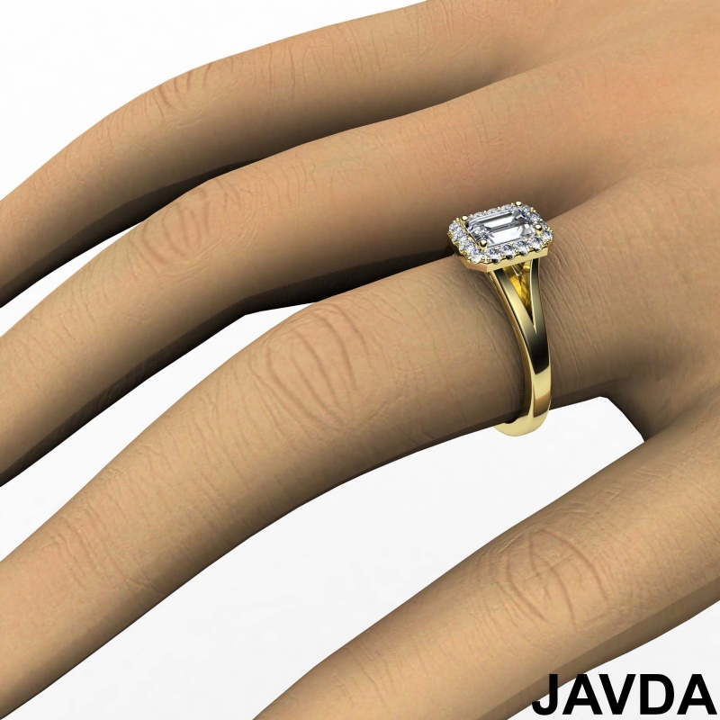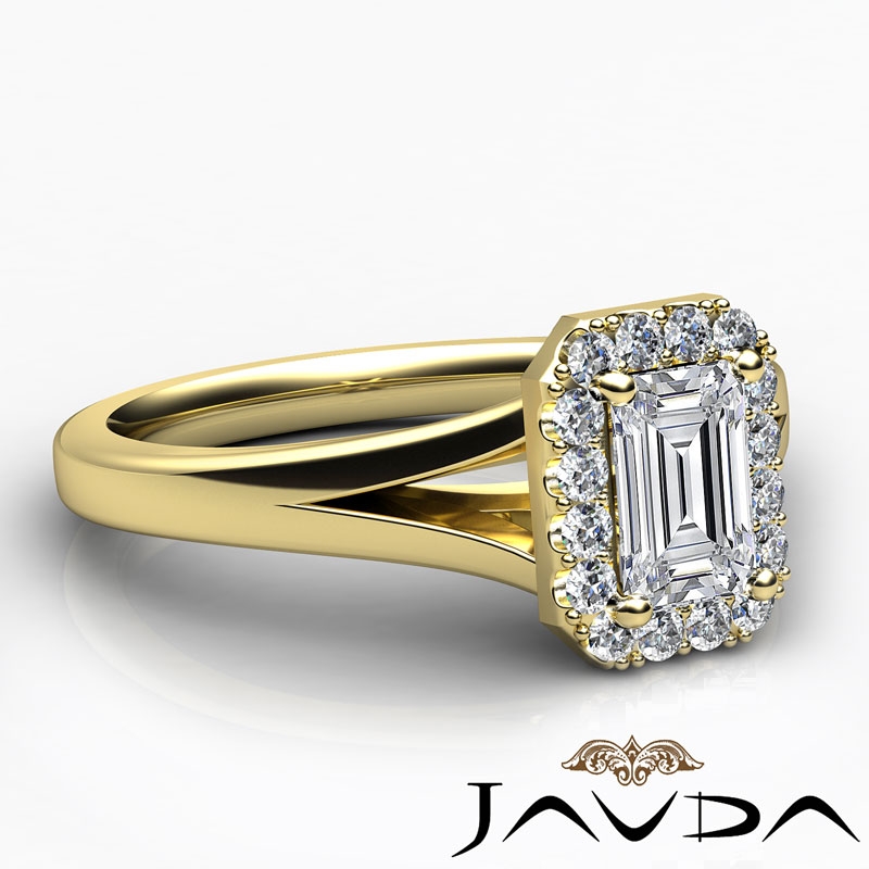 Cathedral Split Shank Halo style Engagement Ring, center is Emerald shape Diamond Report by GIA, E Color & VVS2 clarity, Made in 14k Yellow Gold (0.73 ct. tw.)