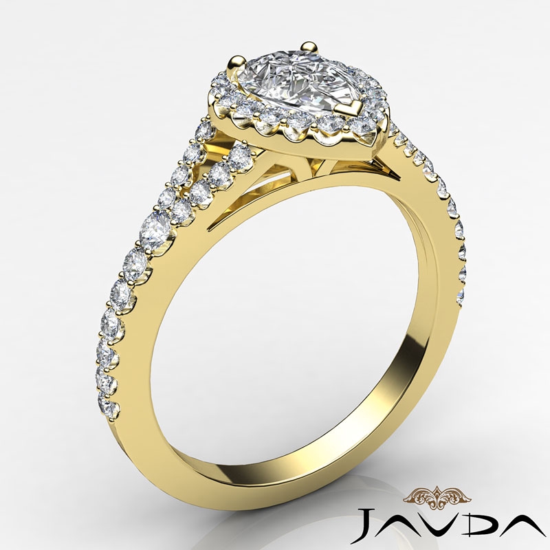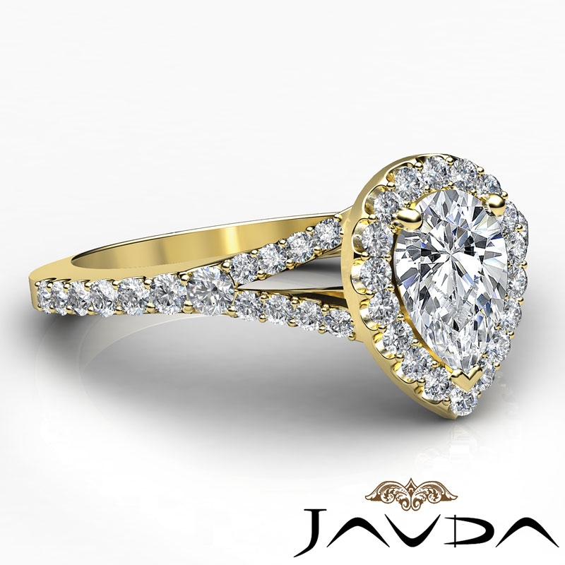 French Set Halo Split Shank style Engagement Ring, center is Pear shape Diamond Report by GIA, D Color & VS1 clarity, Made in 14k Yellow Gold (1.09 ct. tw.)